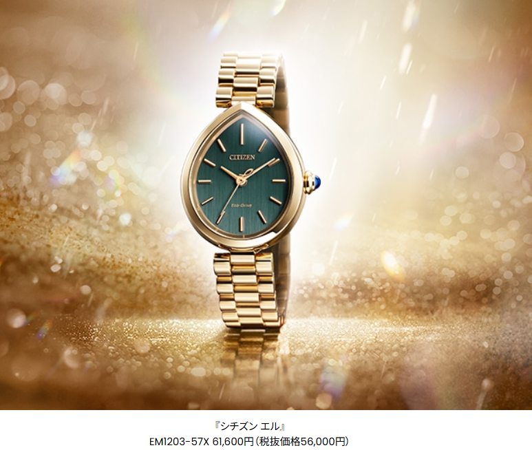 news 2026.03.05 『CITIZEN L』 雨の雫をイメージしたジュエリーライクな新作が登場シチズン時計は、「自然の輝きをまとって、ひとつ上の自分になれる、ジュエリーライクウオッチ」ブランド『CITIZEN L(以下シチズン エル)』から、雨の雫をイメージしたジュエリーライクデザインの新モデル4モデル【希望小売価格53,900円~61,600円(税抜価格49,000円~56,000円)】を2026年4月9日に発売します。 「Rain(雨)」と「Bella(美しい)」を組み合わせ、“RAINELL”(レイネル)と名付けられた新製品は、雨の雫のように繊細で自然の静けさを感じさせるデザインが特徴的。 優雅な曲線を持つドロップ形状を印象付けるかのように、腕の動きでリズミカルな輝きを演出するボリュームある3列バンドを採用。彫刻的なフォルムは、立体感と陰影が美しく際立ち、どの角度から見ても洗練された存在感を放ちます。文字板には、霧雨を思わせるヘアラインパターンを施し、クラシカルで落ち着いたバランスのインデックスを配置、上品な印象に仕上げました。カラーは、ワントーンのシルバーとゴールドに加え、深く静かな森を連想させるグリーン、ラグジュアリーさ漂うパープルの4色を展開。ブランドアイコンであるブルーのりゅうずがアクセントになっています。