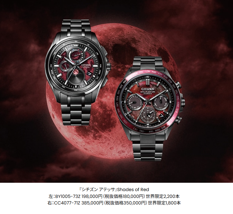 news 2026.02.04 『シチズン アテッサ』 太陽、地球、月が一直線に並ぶ皆既月食をテーマにした 「Shades of Red」が登場 2026年2月26日発売 シチズン時計は、最先端技術を搭載し、グローバルに活躍するビジネスマンをサポートする『CITIZEN ATTESA(シチズン アテッサ、以下アテッサ)』から、皆既月食が生み出す赤い月“Blood Moon”の神秘的な美しさを表現した限定2モデル【希望小売価格198,000円、385,000円(税抜価格180,000円、350,000円)】を2026年2月26日に発売します。 news 2025.12.10 新しいときのはじまりを告げる光が、腕元で華やかに彩りを添える ブランド横断コレクション「KIZASHI Collection」が登場 2026年1月2日発売シチズン時計は、新しいときのはじまりを告げる光が、腕元で華やかに彩りを添える、ブランド横断コレクション「KIZASHI Collection(キザシ コレクション)」全4モデル【希望小売価格71,500円~187,000円(税抜価格65,000~170,000円)】を『シチズン エクシード』、『シチズン アテッサ』、『シチズン クロスシー』、『シチズンコレクション』の4ブランドから2026年1月2日に数量限定で発売します。