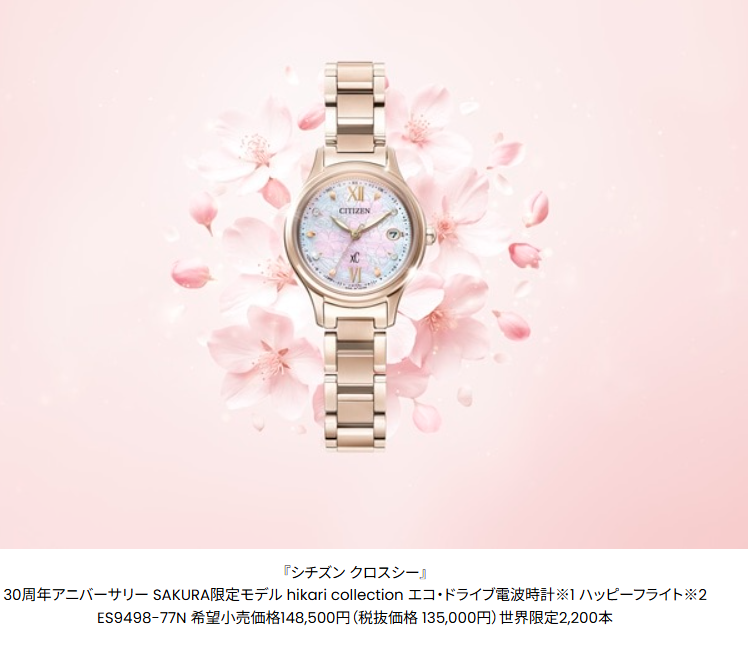 news 2026.02.19 『シチズン クロスシー』 ブランド誕生30周年を彩るSAKURA限定モデル 2026年3月5日発売シチズン時計は、上品で凛としたデザインに、使いやすい機能を兼ね備えたレディスウオッチブランド『CITIZEN xC(シチズン クロスシー、以下クロスシー)』のhikari collection(ヒカリ コレクション)から、ブランド誕生30周年を記念したSAKURA限定モデル【希望⼩売価格148,500円(税抜価格 135,000円)世界限定2,200本】を2026年3⽉5⽇に発売します。